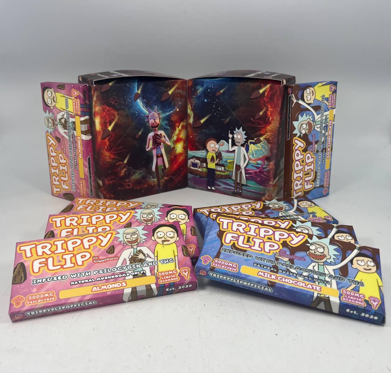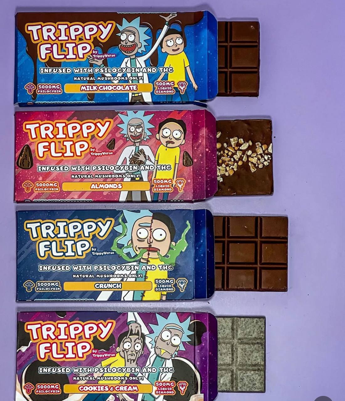 Trippy flip milk chocolate bar Made from very high-grade psilocybin extract, cannabis, and premium milk chocolate. Designed to allow you to enter the orbits of the euphoric cosmos with zero cannabis and shroom aftertaste! Whether your reason is to microdose the new fad while staying relaxed. Also, to access flow states, or to lift the curtains to see nirvana. Trippy Flip cannabis and psilocybin infused chocolates is the vessel!